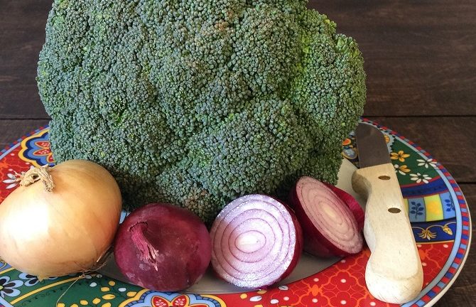 Broccoli in Röschen schneiden, 1/2 Süßkartoffel und Zwiebel würfeln.