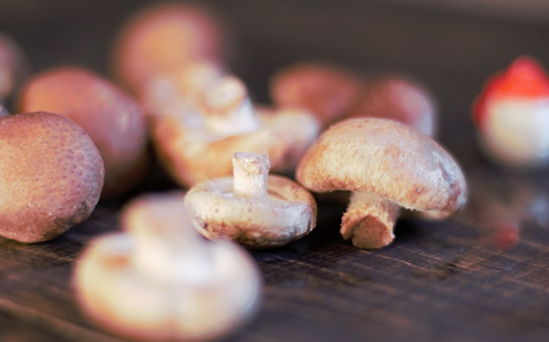 Shitakepilze, Kräuterseitlinge und Birne dazu, mitbraten.